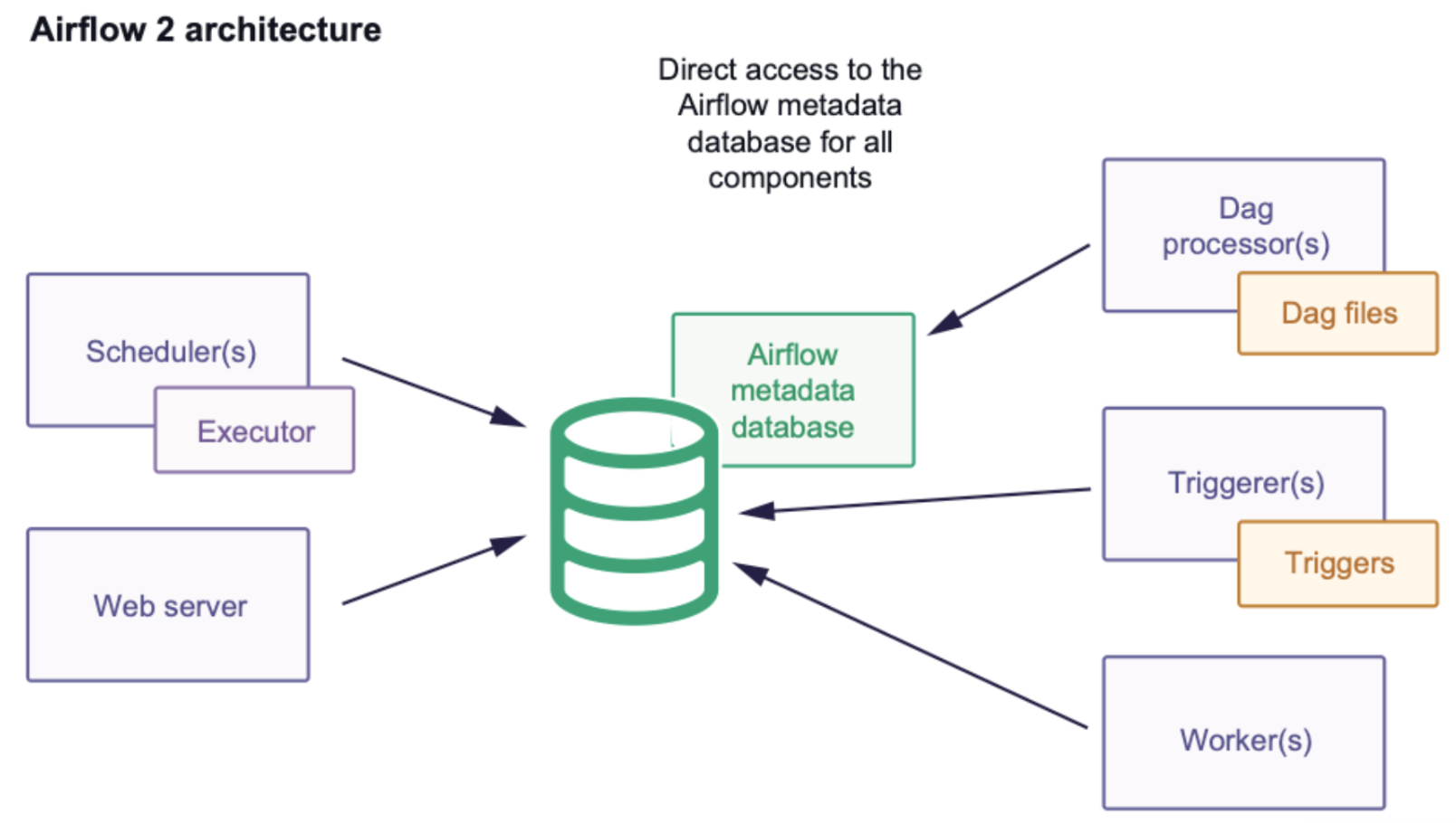 Airflow2 에서는 모든 component 는 Metadata DB 와 직접적으로 통신하였다.
