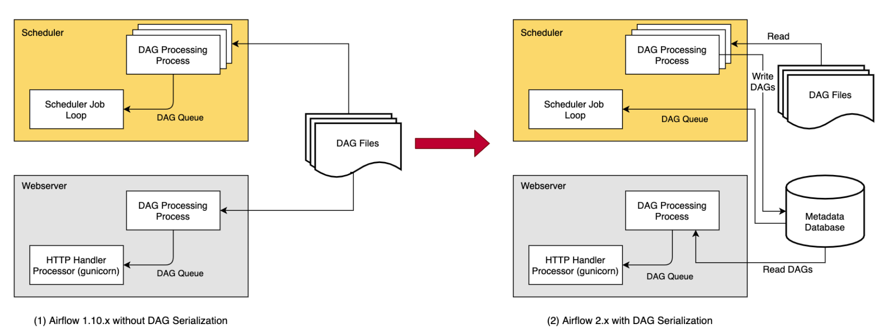 Airflow 1.10.7 부터 DAG 를 json 직렬화해 Metadata DB에 저장하고, Webserver는 DB만 읽는 구조가되어 stateless에 가까워졌고, Airflow 2.0 부터는 Scheduler도 이 직렬화된 DAG 으로 스케줄링을 결정하게 되었다.